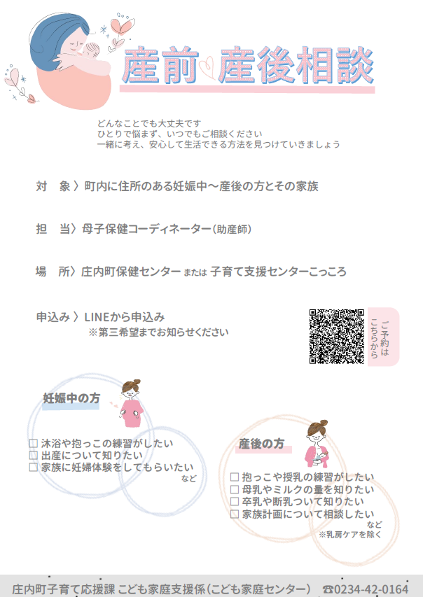 庄内町子育て応援課 こども家庭支援係(こども家庭センター) 電話:0234-42-0164