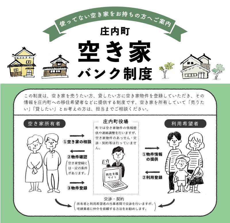 空き家バンク制度は、空き家を売りたい方、貸したい方に空き家物件を登録していただき、その情報を庄内町への移住希望者などに提供する制度です。空き家を所有していて「売りたい」「貸したい」とお考えの方、空き家を「買いたい」「借りたい」とお考えの方は、ぜひ役場建設課までご相談ください。