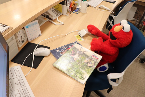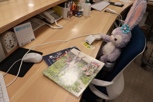 少しカウンターの中が見えます。文房具・電話・カレンダーなど、仕事に必要なものが詰まっています。