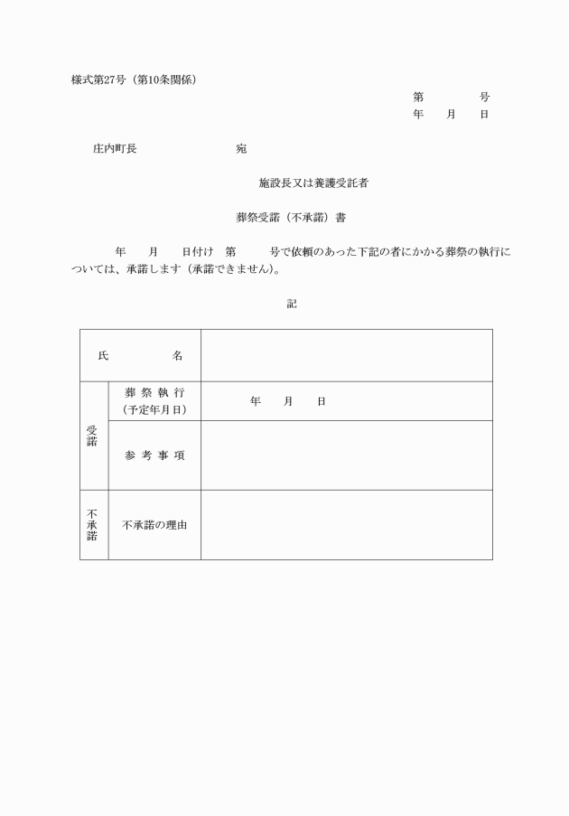 第10条 町長は、法第11条第2項の規定により老人ホーム又は養護受託者にその葬祭を委託するときは、葬祭依頼書(様式第26号)により、当該施設の長又は養護受託者に対し依頼しなければならない。