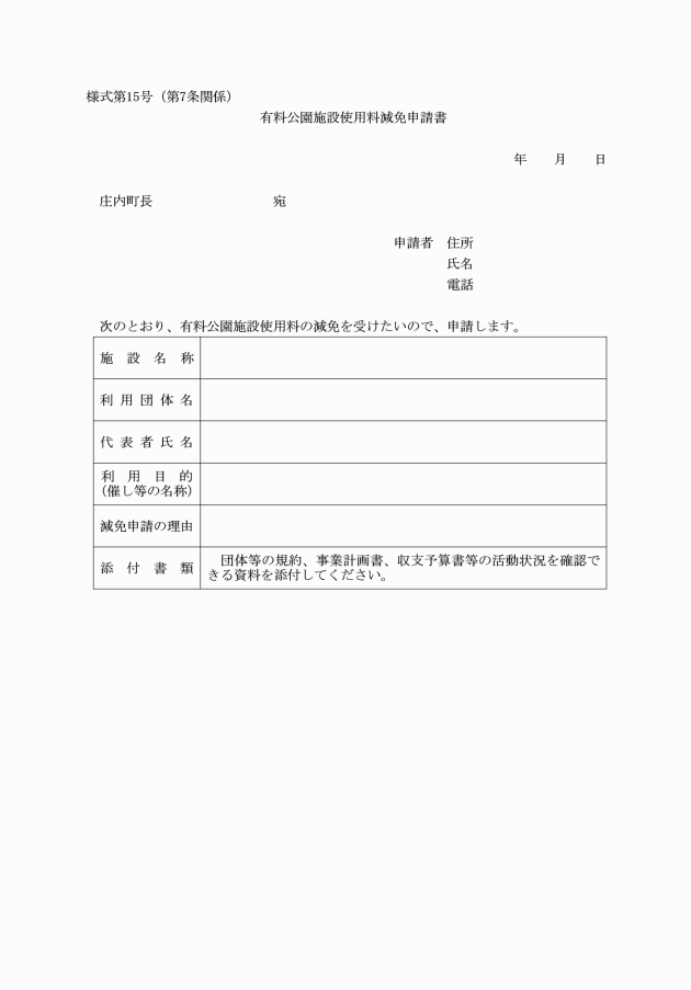 (1) 条例別表第3に規定する町等が、利用する場合(町内の保育園若しくは認定こども園が幼児を対象に実施する事業に利用する場合、町内の中学校又は山形県立庄内総合高等学校(次号において「庄総高」という。)が部活動に利用する場合を含む。) | 免除 |