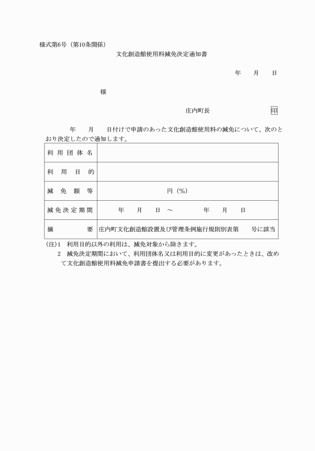 2 町長は、前項の規定により提出された減免申請書を審査し、減免をすることと決定した場合には、決定内容及び町長が別に定める使用料を減免する期間(以下この条において「減免決定期間」という。)を文化創造館使用料減免決定通知書(様式第6号)により通知するとともに、文化創造館利用団体減免リスト(以下この条において「減免リスト」という。)にその内容を記載するものとする。ただし、減免決定期間の満了により再度の減免を受けようとする場合であって、前項の減免申請書の団体、利用目的等並びに町長が決定した別表に定める利用区分及び減免額等が、それぞれ減免リストの内容と同じときは、減免リストを更新し、その通知を省略することができる。